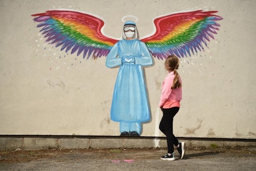A girl looks at a mural by artist Rachel List paying tribute to NHS staff battling the COVID-19 outbreak painting on a wall in Pontefract, northern England, on April 23, 2020.