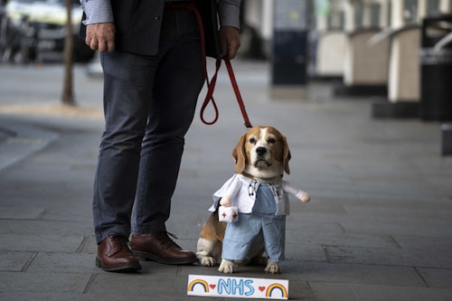 A dog in fancy dress sits with its owner with a sign paying tribute to NHS staff during a national "clap for carers" to show thanks for the work of Britain's National Health Service (NHS) workers and frontline medical staff around the country as they battle with the novel coronavirus pandemic, at Chelsea and Westminster Hospital in London on April 23, 2020.
