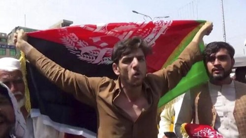 Dozens of people gathered in the eastern city of Jalalabad to raise the national flag a day before Afghanistan's Independence Day, which commemorates the end of British rule in 1919. They lowered the Taliban flag — a white banner with an Islamic inscription — that the militants have raised in the areas they captured.