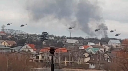 Military helicopters apparently Russian, fly in formation over the outskirts of Kyiv