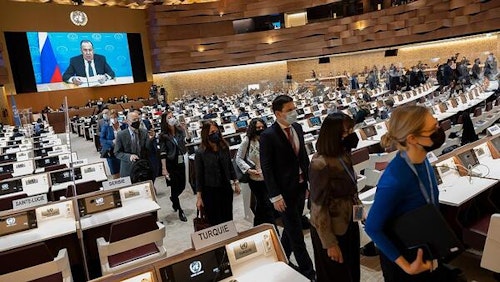 Envoys left en masse as Russia's foreign minister addressed the United Nations in Geneva via video.Washington strikes note of caution over Russian lack of progress