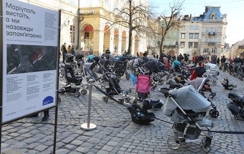Empty pushchairs were lined up to highlight the number of children killed since Russia's invasion on 24 February.