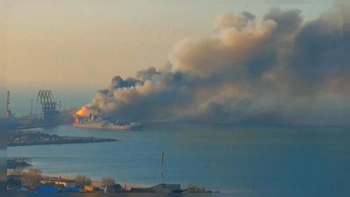 - Ukraine's navy says it has sunk the Russian ship Orsk in the Sea of Asov near Berdyansk. Photos and video show fire and thick smoke coming from the port area.