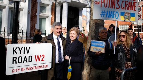 Ukrainian ambassador to the UK Vadym Prystaiko and his wife Inna unveiled a street sign for 'Kyiv Road', a section of road renamed by the City of Westminster council outside the Russian Embassy in London.