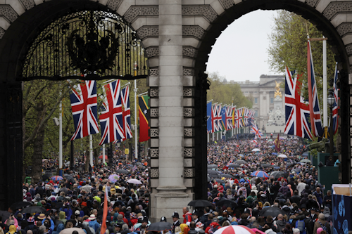 Tens of thousands gathered around the procession route from Buckingham Palace to Westminster Abbey despite the London rain to get a glimpse of the UK's first coronation in 70 years.