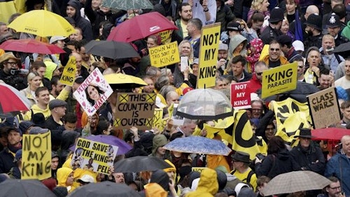 Hundreds of "Not My King" signs were also seized in the process, according to the anti-monarchy group Republic.