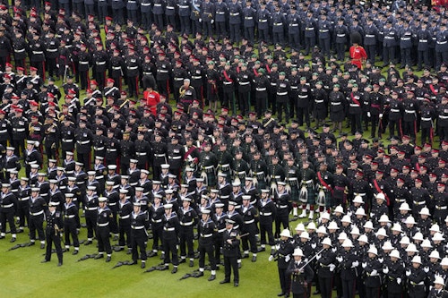 Photo: Members of the armed forces stand in formation in the Buckingham Palace garden after the coronation of King Charles III.