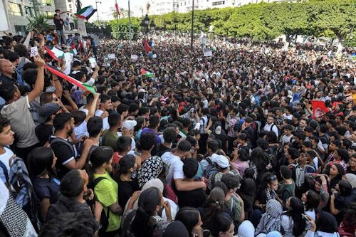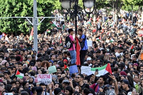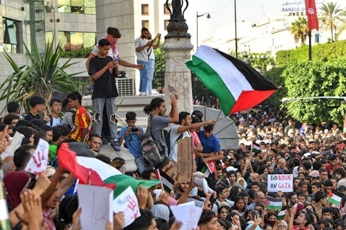 Thousands of demonstrators have gathered again in front of the French embassy in Tunis expressing their anger against a deadly strike on a hospital in the Palestinian city of Gaza which left hundreds dead.