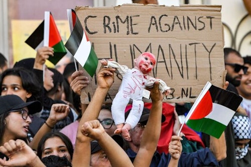 The demonstrators accuse France, as well as the United States, of being “allies of the Zionists” in the war.