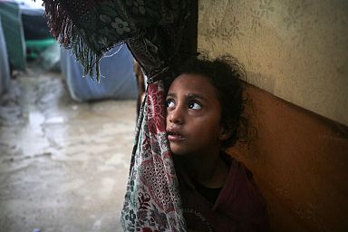 Palestinians struggle with cold weather as they stay in the makeshift tents they set up near Al Aqsa Martyrs Hospital in Deir al Balah, Gaza