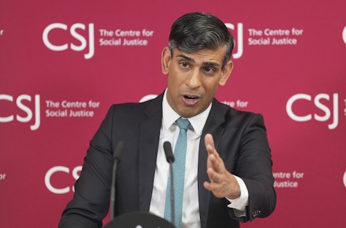 British Prime Minister Rishi Sunak gives a speech in central London, Friday April 19, 2024. AP