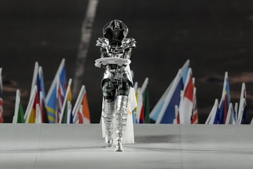 French-Malian singer-songwriter Aya Nakamura has now taken the stage donning a golden-plume gown following a grandiose homage to French legendary singer Charles Aznavour with a marching band of dozens of members.