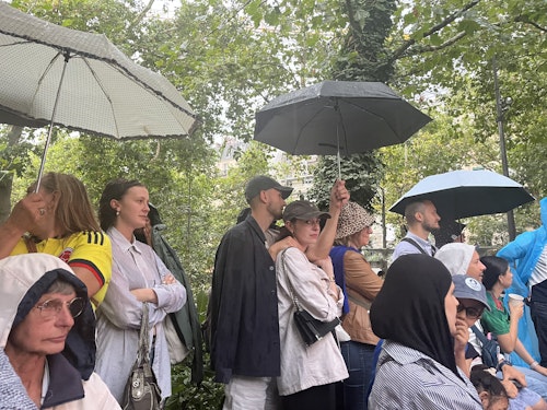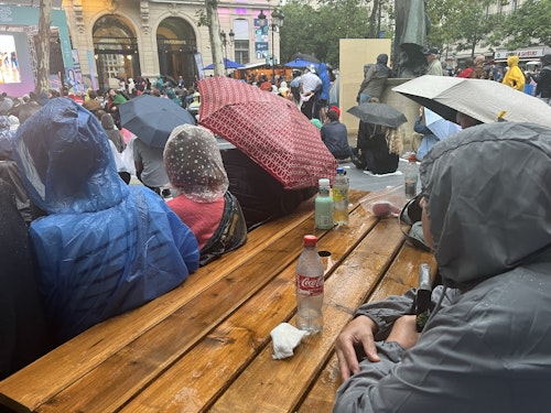 Despite the rain, the crowds are sticking it out in Parisian squares and remaining enthusiastic. Although a few soggy spectators are getting up to head home as the rain intensifies, many will not be swayed.