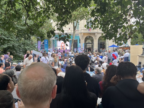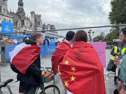 Tourists gather in the 11th arrondissement of Paris. While some people are lucky enough to have bagged a seat in front of the district’s town hall, hundreds of other people are tightly packed around barriers to try and watch the screen.