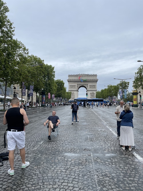 A usually congested avenue, tourists are taking advantage of the lack of cars to pose in front of one of the most iconic Parisian monuments - the Arc de Triomphe. Spot the person who took comfort to another level by bringing a chair!