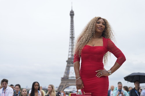 Tennis legend Serena Williams spotted in Paris in a bright red dress standing out over the grey Paris sky.