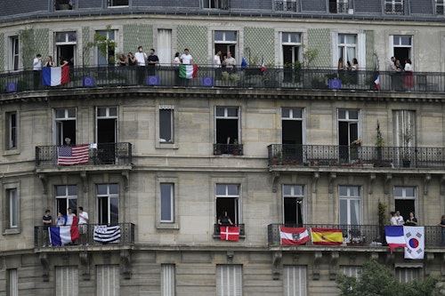The French delegation passed under the Austerlitz Bridge shortly after 9:15 p.m. to huge cheers from the rain-soaked crowd lining the riverbanks and watching from nearby apartment windows.