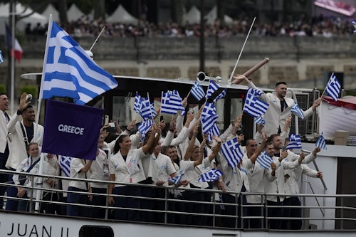 Greece is the first delegation to appear on Seine river, followed by the Refugee Team