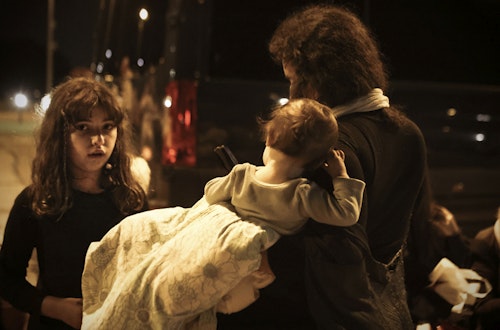 A girl stands near her mother and sibling as the first group of Bulgarian citizens evacuated from Israel.