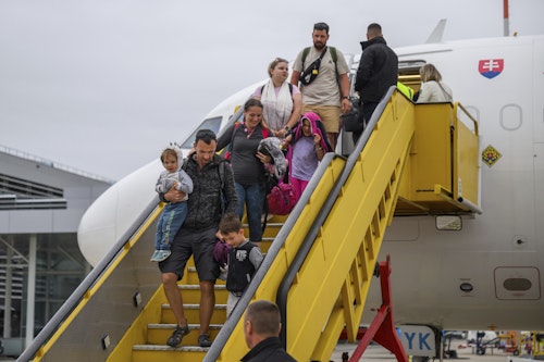 The first group of Bulgarian citizens evacuated from Israel, along with dozens of foreign nationals from Slovenia, the US, Belgium, Albania, Kosovo and Romania, arrive at Vassil Levsky airport in Sofia.