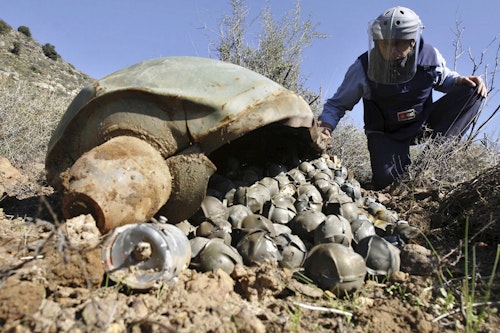 It shows a munition hitting a building, sending a dark plume of smoke into the air.