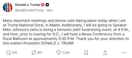 "We took a little excursion because we felt we had to do that to get rid of some people. And I think you'll see it's going to be a short-term excursion," Trump told a gathering of Republicans at his golf club in Doral, Florida.