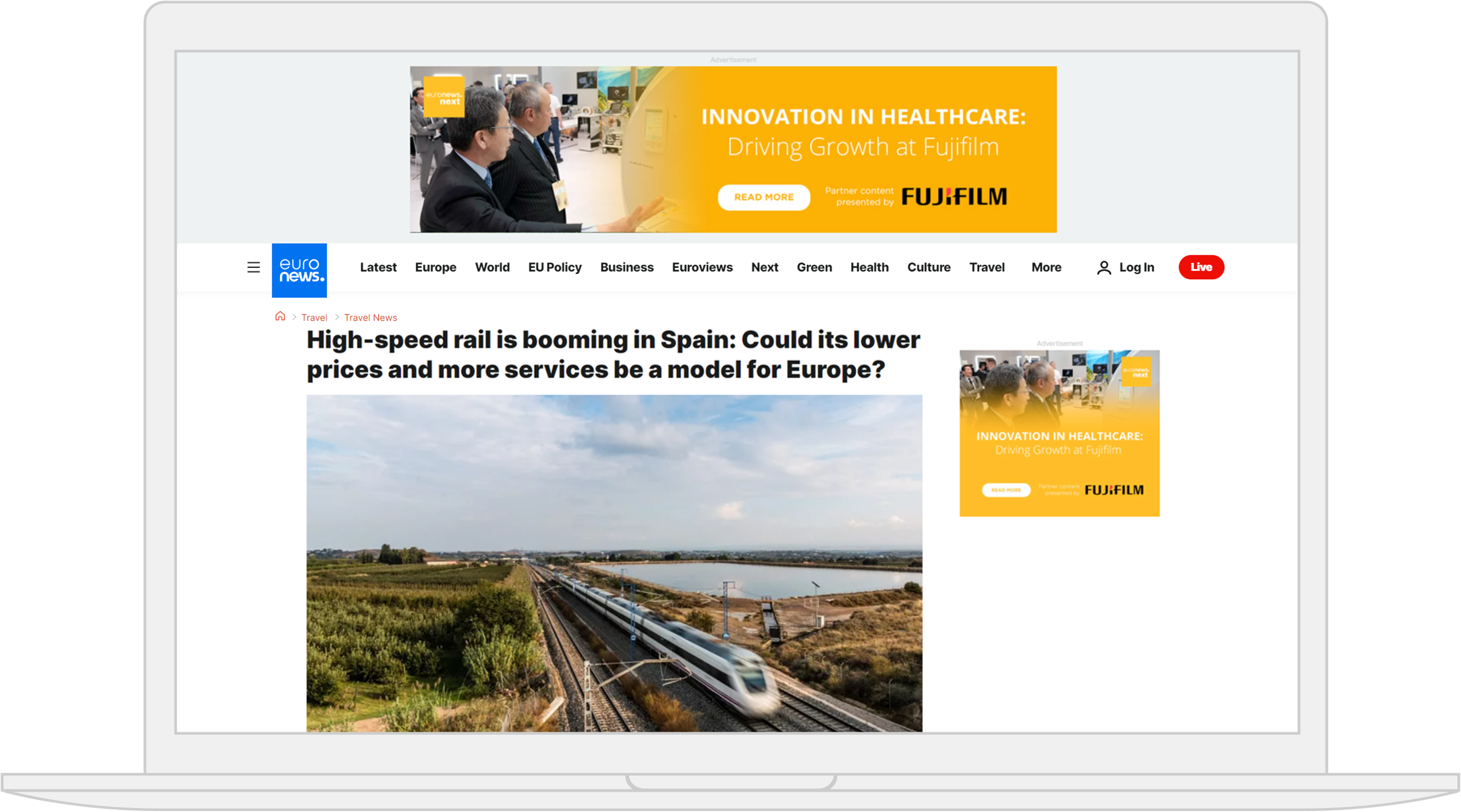 Euronews and Euronews Next native articles with Fujifilm were available in English, German, and French, accompanied by various ad display formats and boosted via the Euronews Next Facebook page, driving visibility for Fujifilm and positioning its significance in the health industry.
