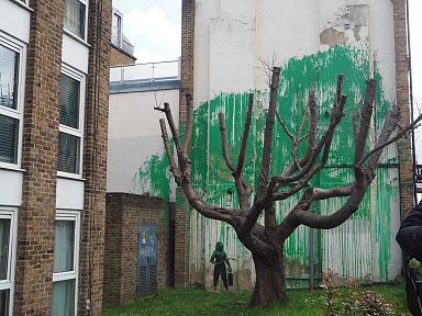 The artwork was painted behind a cut-back tree to look like foliage, with a stencil of a person holding a pressure hose next to it.