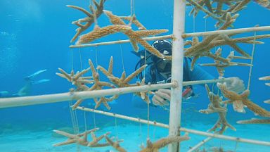 "We are outplanting more than seven and a half thousand pieces of coral this year over the 10 restoration sites we have... On every tree, in every nursery we have here, all the corals are from the same genotype. And this way, when they are put together or they touch together, they will grow together and fuse together," says Reef Renewal's restoration technician Ernst Noyons.