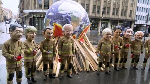 Activists on Friday posed as world leaders incapable of putting out the fire as the planet burns. Dressed as firefighters, the mock world leaders did little to tackle the climate crisis and to save a planet "on fire".Greenpeace warns countries may try to scrap line on fossil fuel from COP26 deal