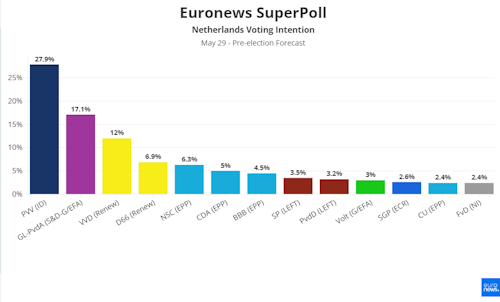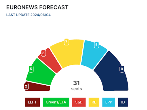 An IPSOS survey commissioned by Euronews projects the far-right Identity and Democracy group in the European Parliament to secure 18 of the 31 seats allocated to the Netherlands, while the Greens and Renew are projected to win seven seats each.