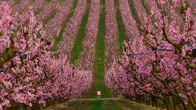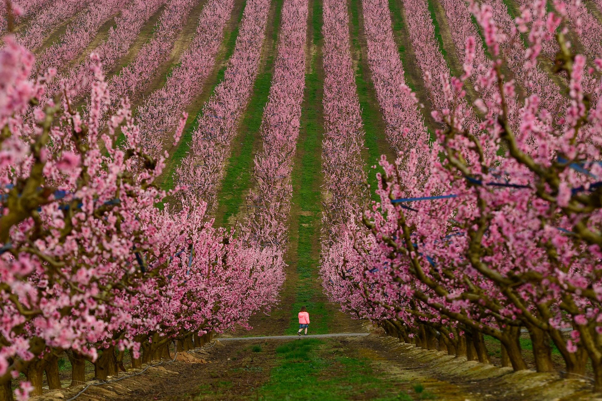 A child walks among blooming trees in a peach orchard in Aitona in Catalonia, Spain. March 5, 2021