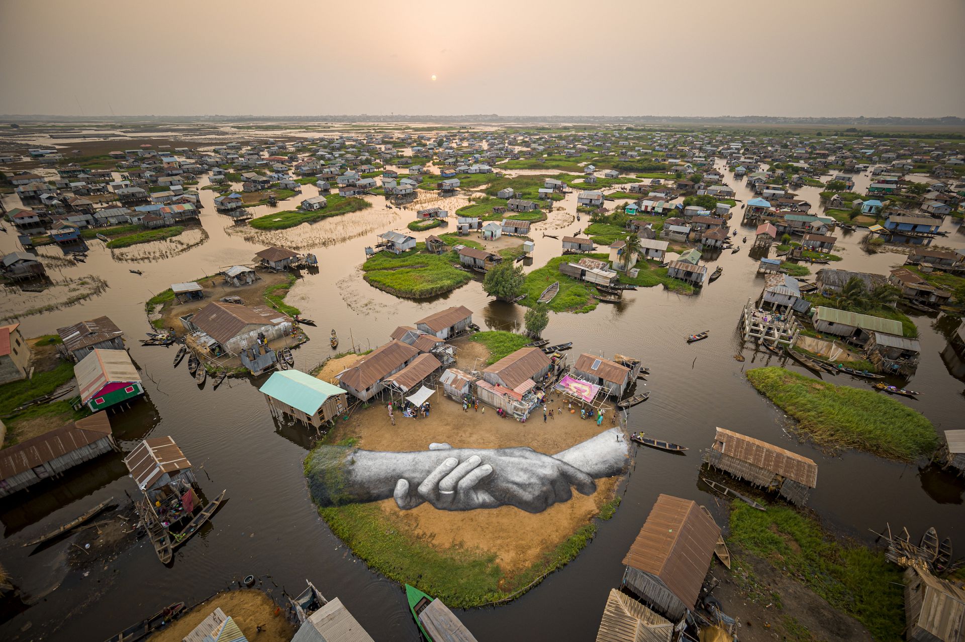 A giant land art fresco by French-Swiss artist Saype, painted for his worldwide 'Beyond Walls' project in Ganvie, village on stilts, Benin. March 3, 2021