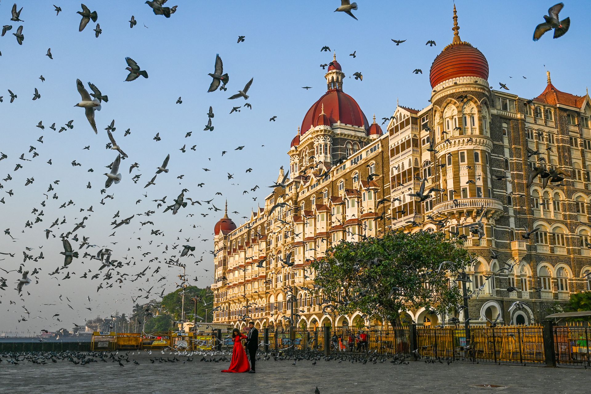 A couple poses for photographs in front of the Taj Mahal hotel in Mumbai. March 4, 2021