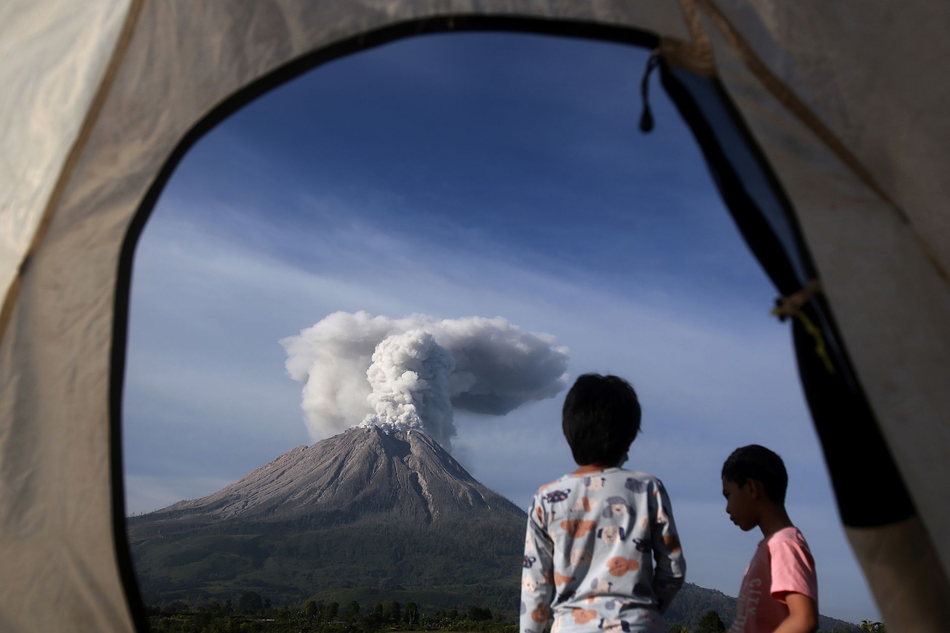 Indonesian youths watch Mount Sinabung erupting in Karo, North Sumatra, Indonesia. March 11, 2021