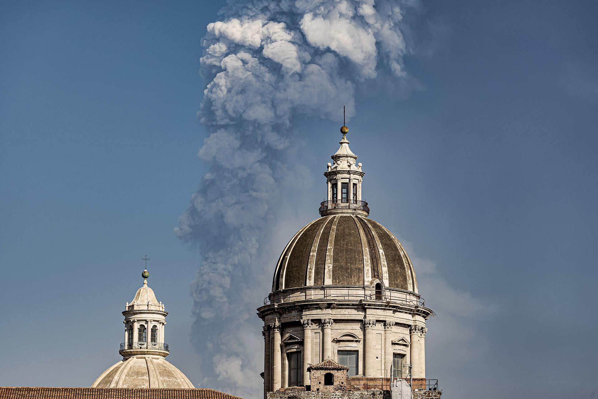 Smoke billows from a crater of Mount Etna volcano behind the dome of the Catania Saint Agatha cathedral in Catania, southern Italy. March 4, 2021